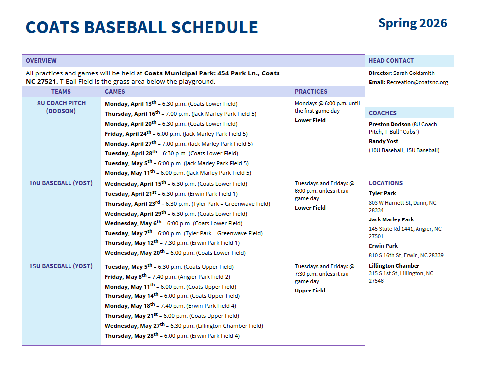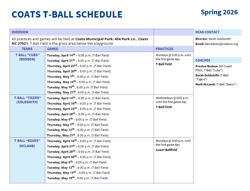 Coats Parks & Recreation Youth Baseball & Softball Leagues