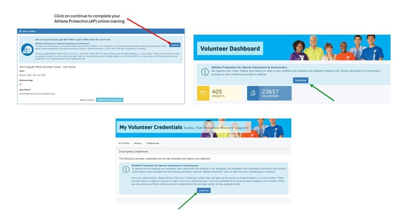 If Athlete Protection is required, expired, incomplete or cancelled, look for the continue button in any of the three views pictured below. The link will take you to Great Academy for the online training course, Athlete Protection (AP). Please use the same credentials from Volunteer Matter, whether you're signing up or a returning volunteer.