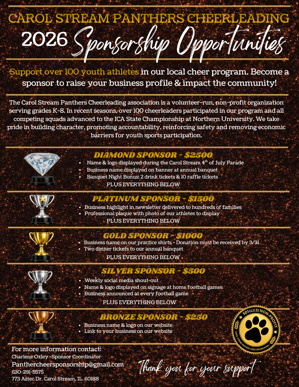Would you like to see your business logo advertised here? Email us at PantherCheerSponsorship@gmail.com to learn more about our sponsorship opportunities!