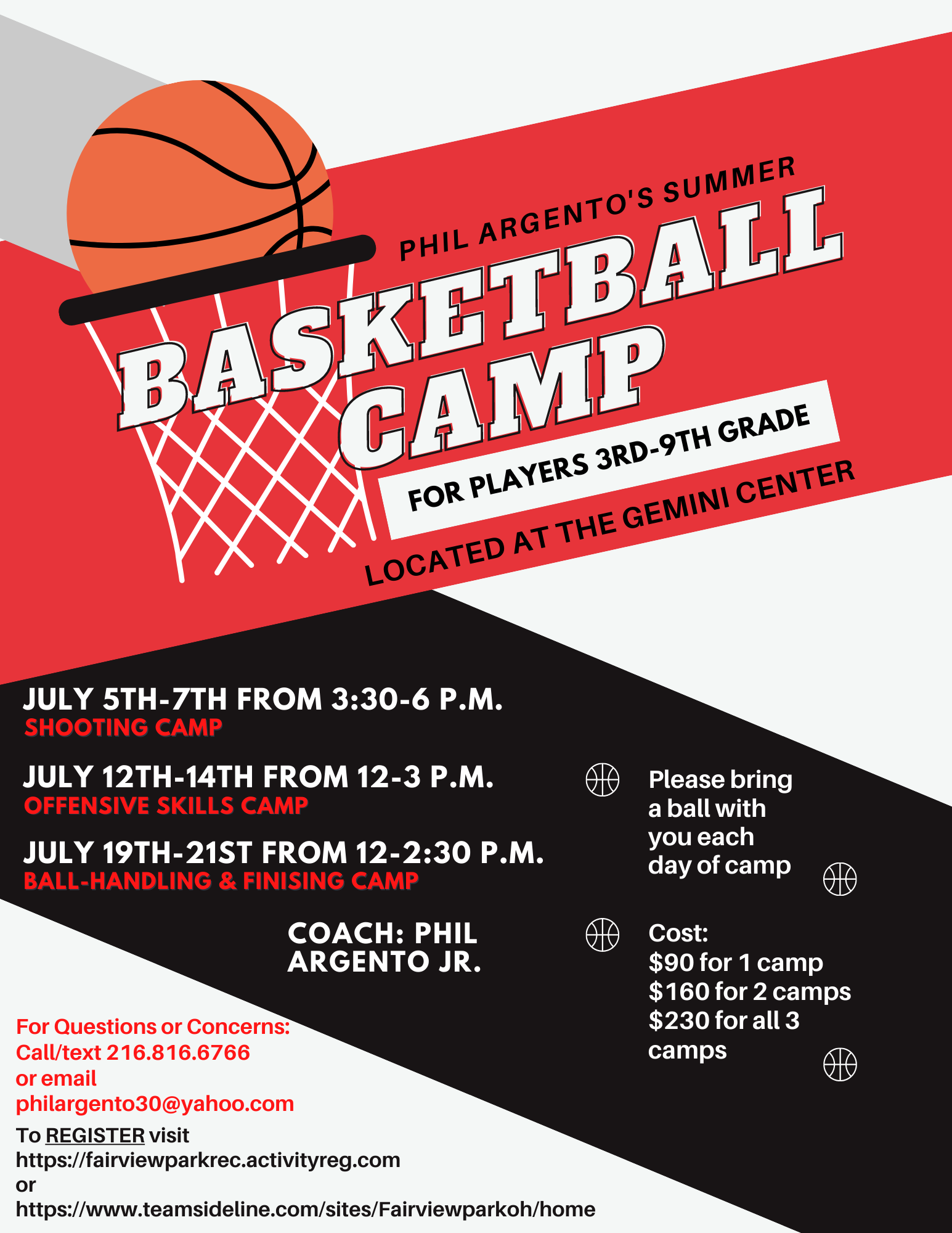 "Phil Argento Jr will be running a series of basketball camps this July focusing on a variety of offensive skills. Campers will be taught how to develop their own workout routines and will receive instruction from some of the best trainers in the area. The camp is open to anyone in 3rd - 9th grade (campers grouped by grade/skill level) and camp size will be limited so each player can receive the max amount of reps possible per day. Please BRING A BALL with you each day of camp. The breakdown of the camps is as follows: