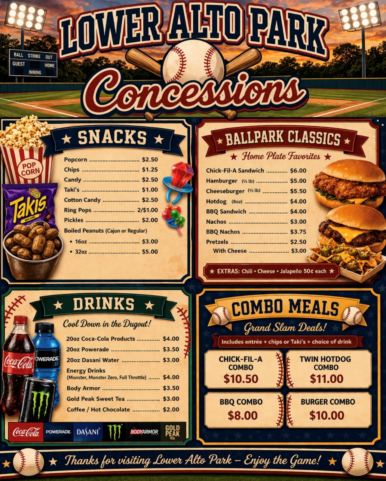 *Each concession stand carries the majority of the same items, with the exception of the concession stands at the turf complex, and the concession stands inside the gymnasiums. Explore the menu to see what each place has to offer!*