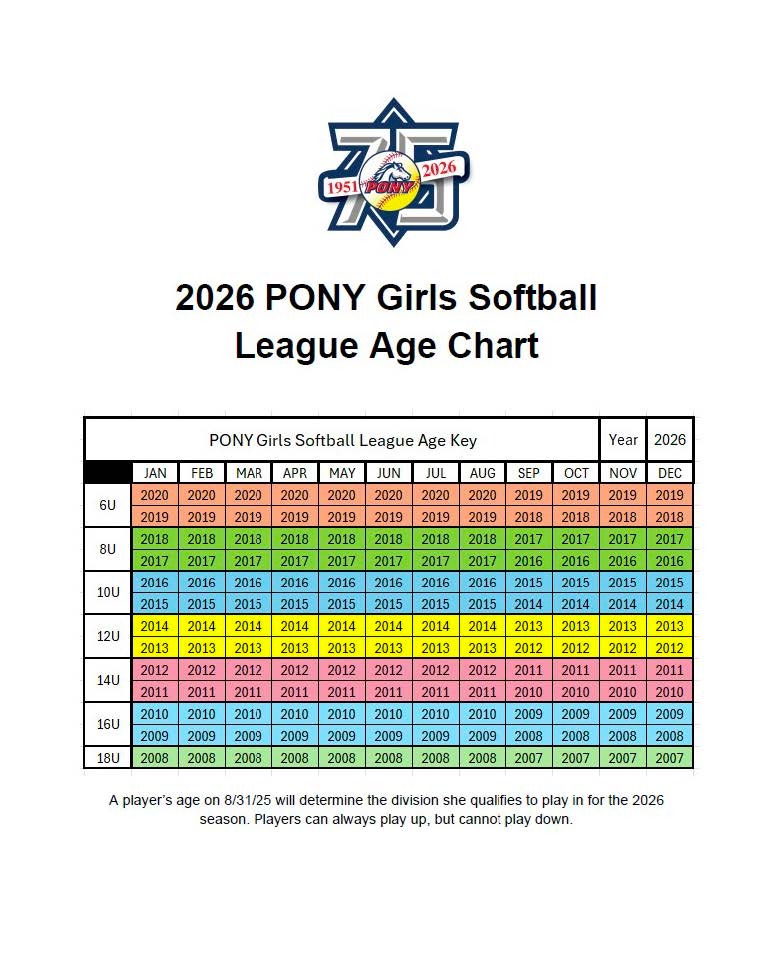 Our softball program is structured to ensure players have fun and develop their skills at a pace that's right for them. Using PONY's League Age Key, we group plalyers into the following divisions: