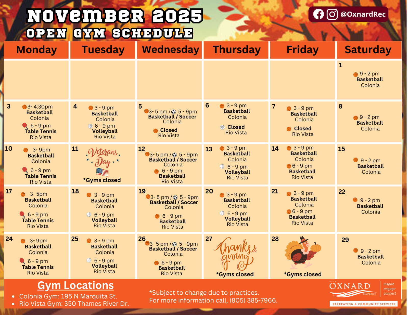 The City of Oxnard offers open gym to the public throughout the year with varying dates each season. Open gym programming is free and available with limited equipment for in-house use. A flyer with this season's open gym offerings is posted below. You can find updates on open gym on social media by following @OxnardRec on Instagram and Facebook. Open gym may change based on our programming schedule throughout the year. Please feel free to contact us at the Recreation Office, (805)385-7995, or at Colonia Gym, (805)385-7966, for the most up-to-date information.