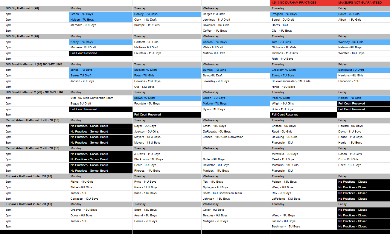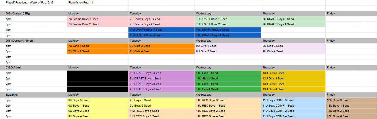 Assigned playoff practices will be made known mid-season. Only playoff qualified teams will practice the week of 2/9. Assigned spots will most likely differ from regular season selections.